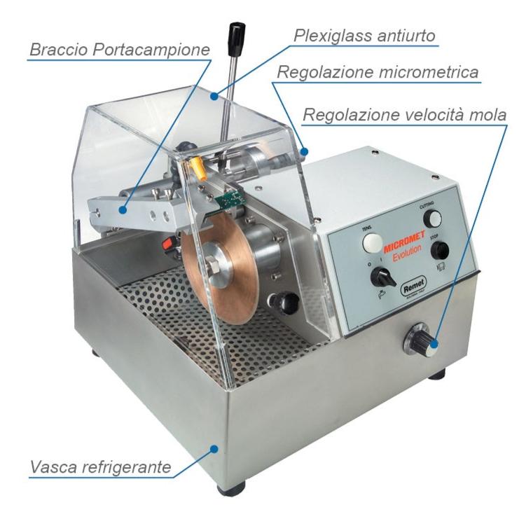 SEMIAUTOMATICA: l’avanzamento avviene mediante pesi regolabili con contrappeso di bilanciamento. La velocità mola regolabile in continuo (0 – 3000 giri/minuto) e la traslazione trasversale del braccio porta-campione mediante micrometro permettono il taglio e l’assottigliamento di qualsiasi tipo di materiale. Grande attenzione è stata posta per eliminare i problemi legati ad usura e corrosione: il corpo macchina e tutti i componenti principali sono in acciaio inox; i componenti interni sono in acciaio rivestiti al nichel chimico e anticorodal trattato GHA.