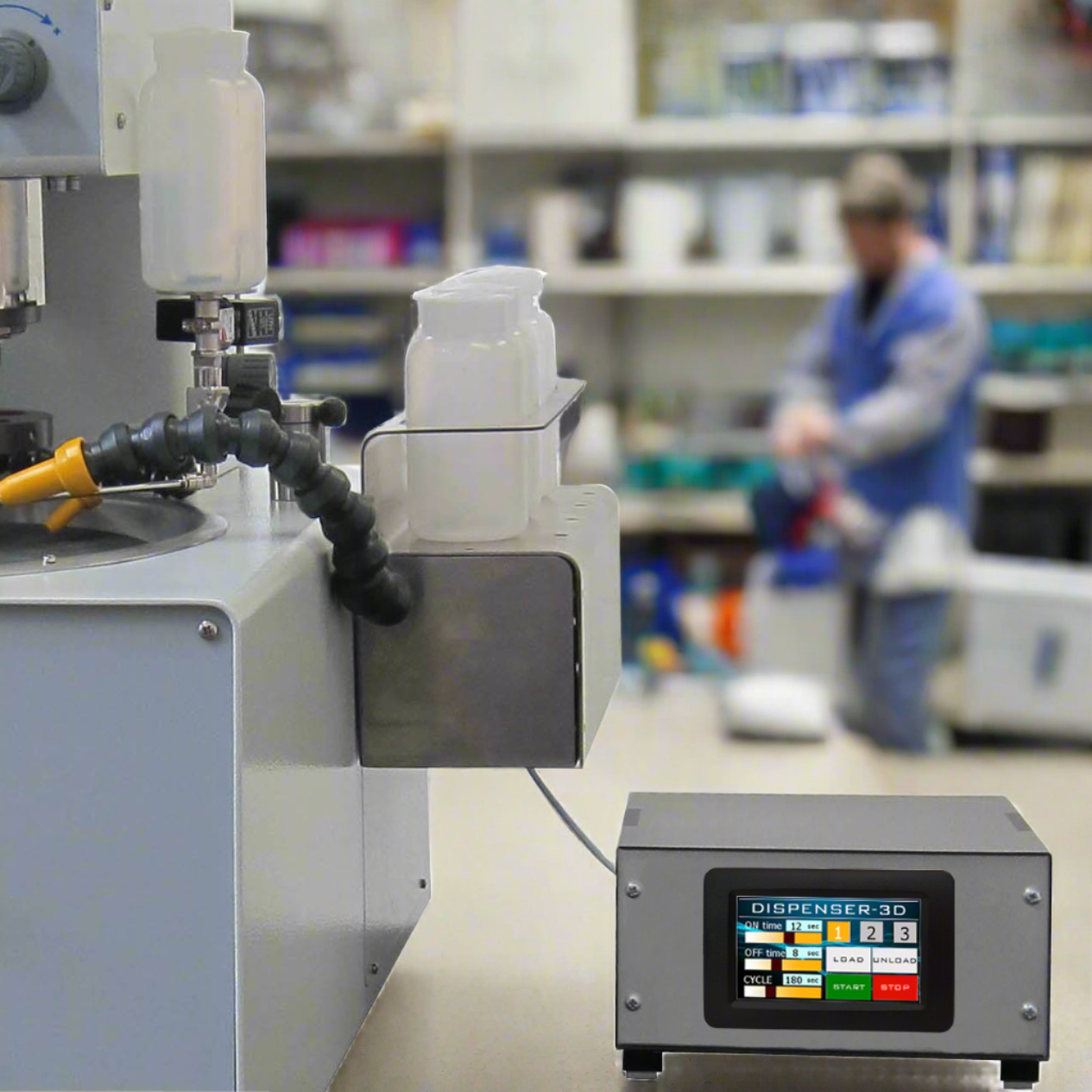 Per automatizzare completamente la preparazione dei campioni è indispensabile affiancare alle pulitrici automatiche il dispensatore delle sospensione abrasive. Si tratta di una unità autonoma corredata di timer programmabile per la regolazione della durata del ciclo di lavoro con fasi pausa/lavoro. Può comandare fino a 3 dispensatori selezionabili singolarmente.