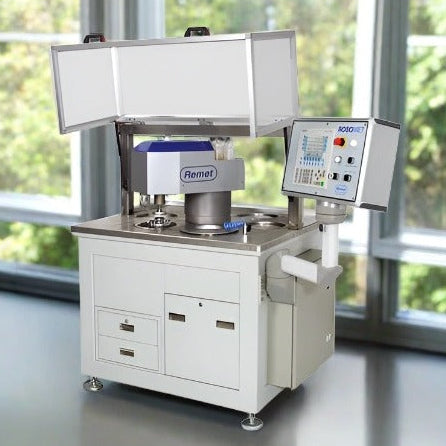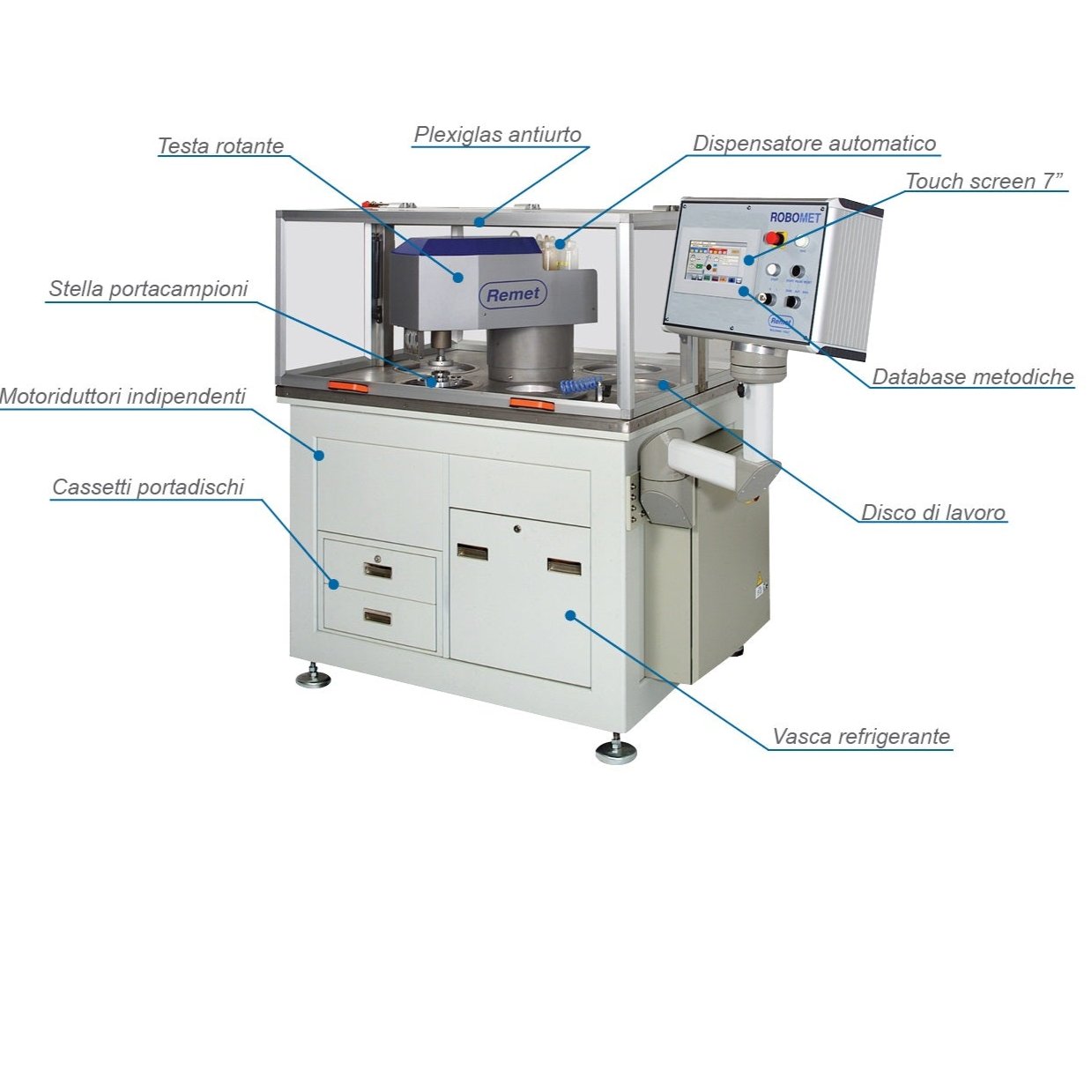 Smerigliatrice-pulitrice computerizzata per la preparazione di campioni metallografici secondo cicli completamente automatici. ROBOMET è dotata di 5 stazioni di lavoro e di una stazione di lavaggio, disposte in cerchio attorno alla testa portacampioni. I campioni vengono montati su una apposita stella portacampioni, la quale viene inserita, mediante un attacco rapido, nella testa automatica. La testa esegue il ciclo di lavoro programmato spostandosi da una stazione all’altra ed operando la preparazione nel pieno rispetto dei parametri selezionati. Alla testa sono collegati gli ugelli per l’erogazione delle sospensioni abrasive e del lubrificante. L’operatore è isolato dalla zona di lavoro mediante una protezione in plexiglas dotata di microinterruttore di sicurezza.