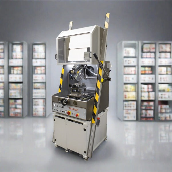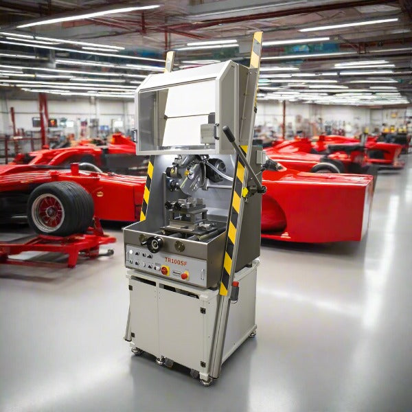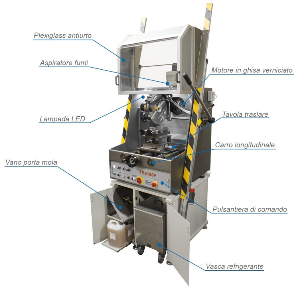 La TR100 SF è una troncatrice a tre assi con basamento a sviluppo verticale ed è particolarmente adatta per il taglio di grandi particolari grazie al carro longitudinale. Struttura in acciaio inox, coperchio in plexiglas, componenti in acciaio inox e ghisa rivestita con nichel chimico, motore mola in ghisa e trasmissione mediante cinghia Poly-V. Refrigerante contenuto in una vasca carrellata alloggiata nel basamento.