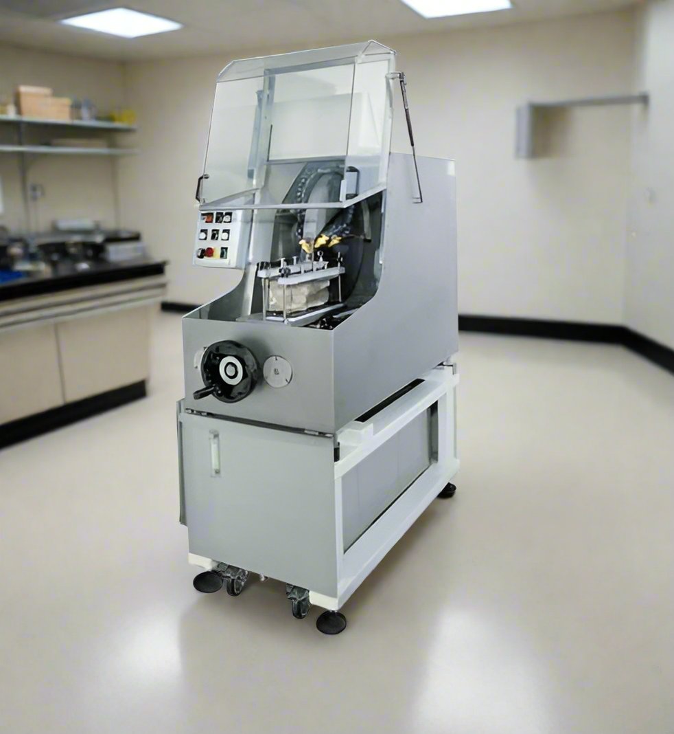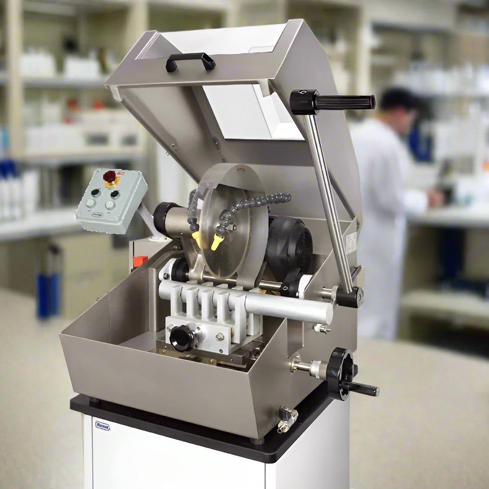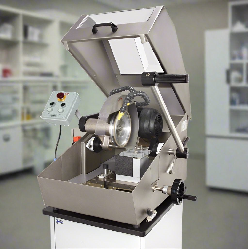 La refrigerazione del taglio è garantita da due ugelli orientabili montati sul carter mola, allacciati direttamente alla rete idrica; l'erogazione dell'acqua è comandata da una elettrovalvola azionata simultaneamente all'accensione del motore mola. All'interno del corpo macchina si ha la decantazione dei residui di taglio, mentre l'evacuazione dell'acqua avviene direttamente allo scarico del laboratorio. Le troncatrici sono costruite nel pieno rispetto delle norme CE (comandi a bassa tensione, microinterruttore interbloccato sul coperchio, protezione motore mola, ecc.). La macchine sono supportate da piedini antivibranti regolabili e sono corredate di istruzioni d'impiego e chiavi di lavoro.